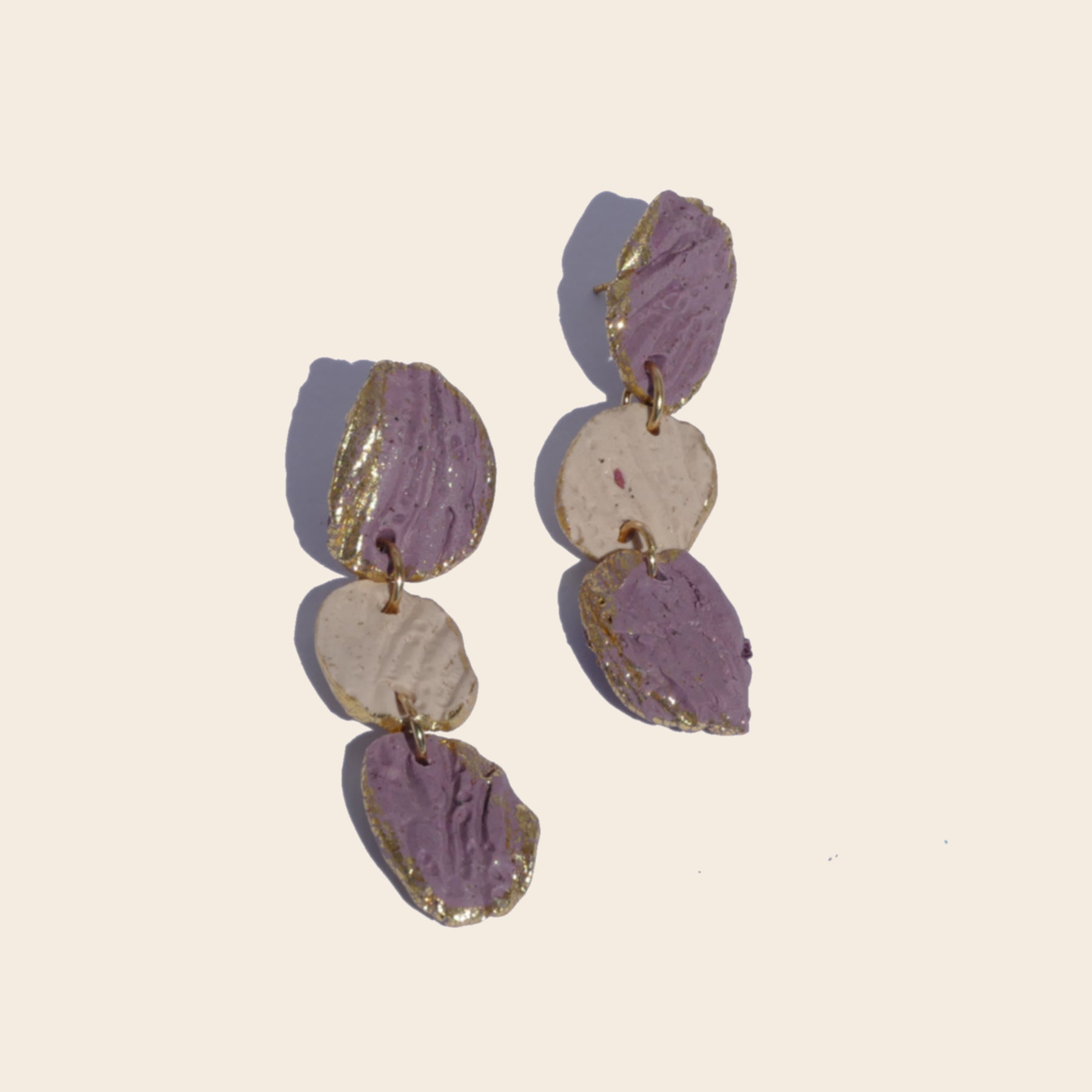 Tres piezas que fluyen entre crema y malva, adornadas con sutiles destellos de pan de oro, diseñadas para despertar tu fuerza y delicadeza a la vez.