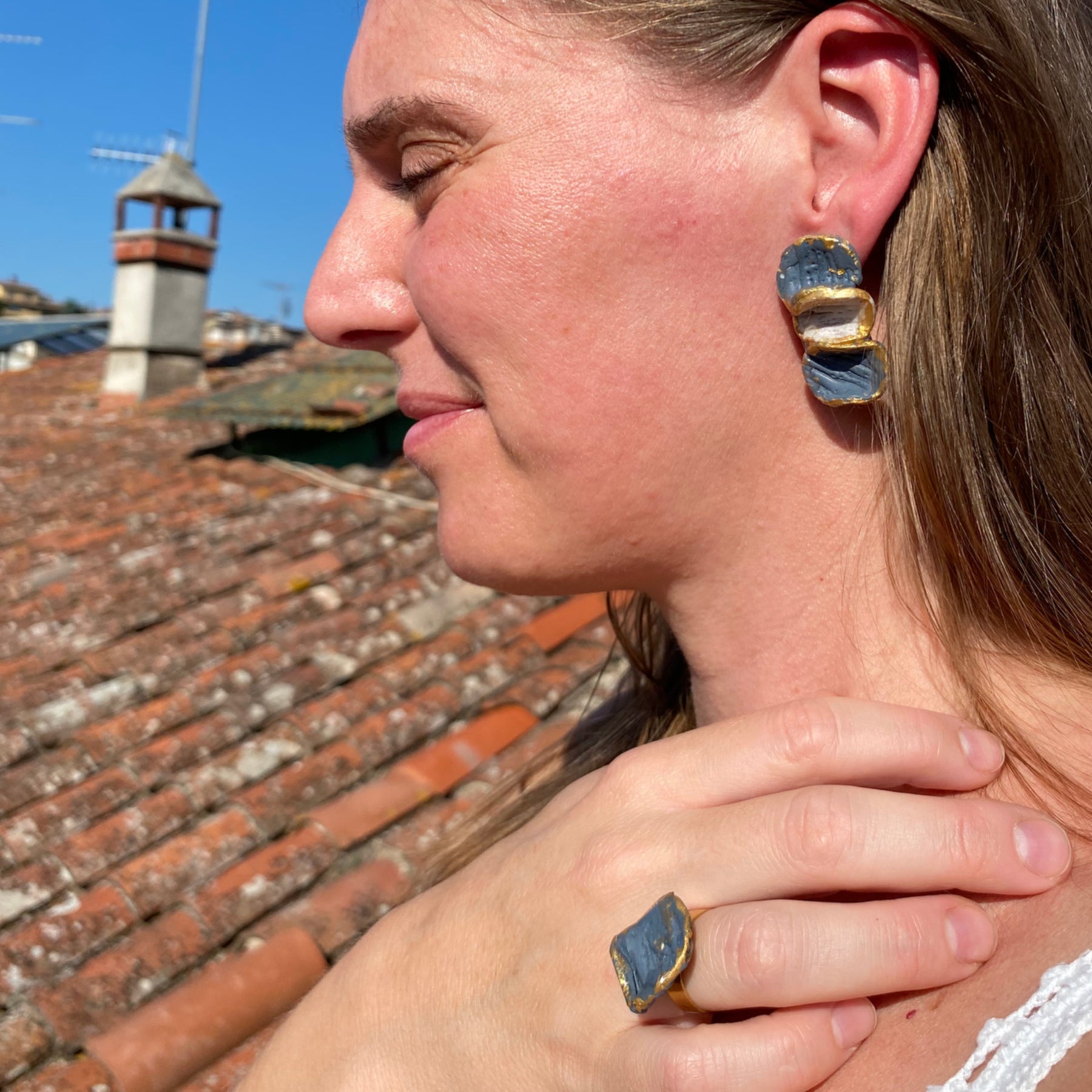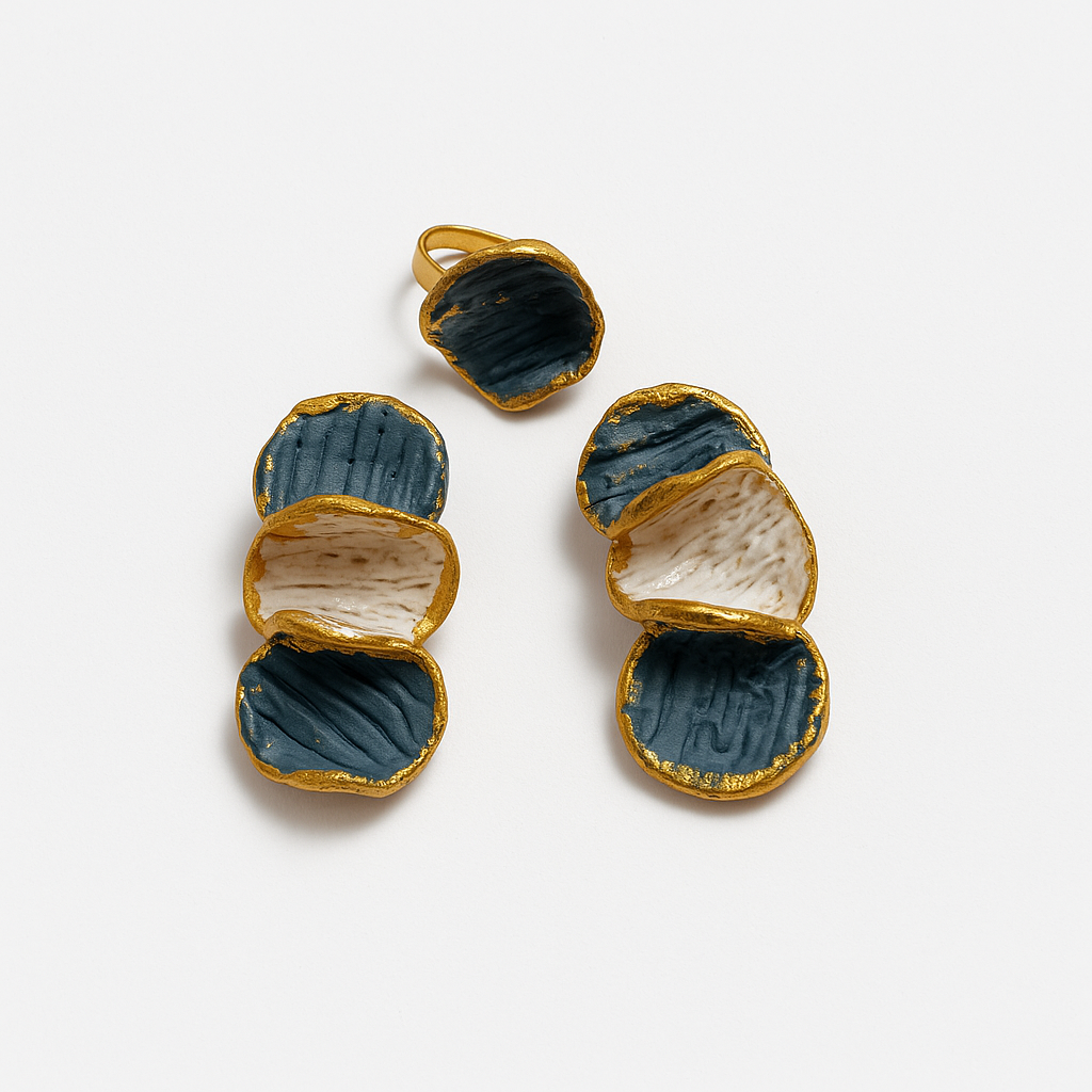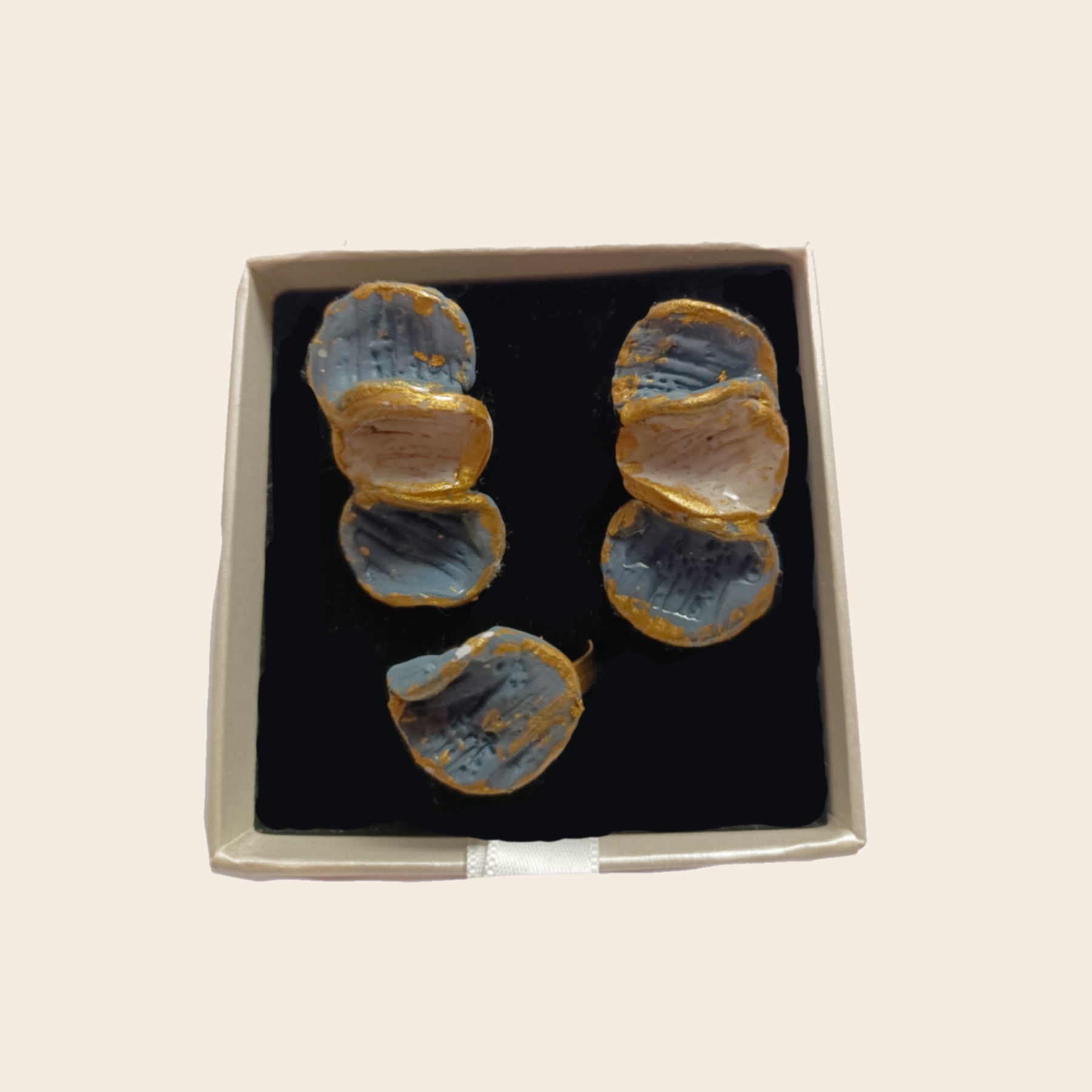 Cada pétalo, en azul y crema, iluminado con destellos dorados en resina, parece flotar como un susurro de gracia y pasión. El anillo, con su delicado pétalo azul, completa el conjunto, transformando cada gesto en un acto de belleza y energía vital.