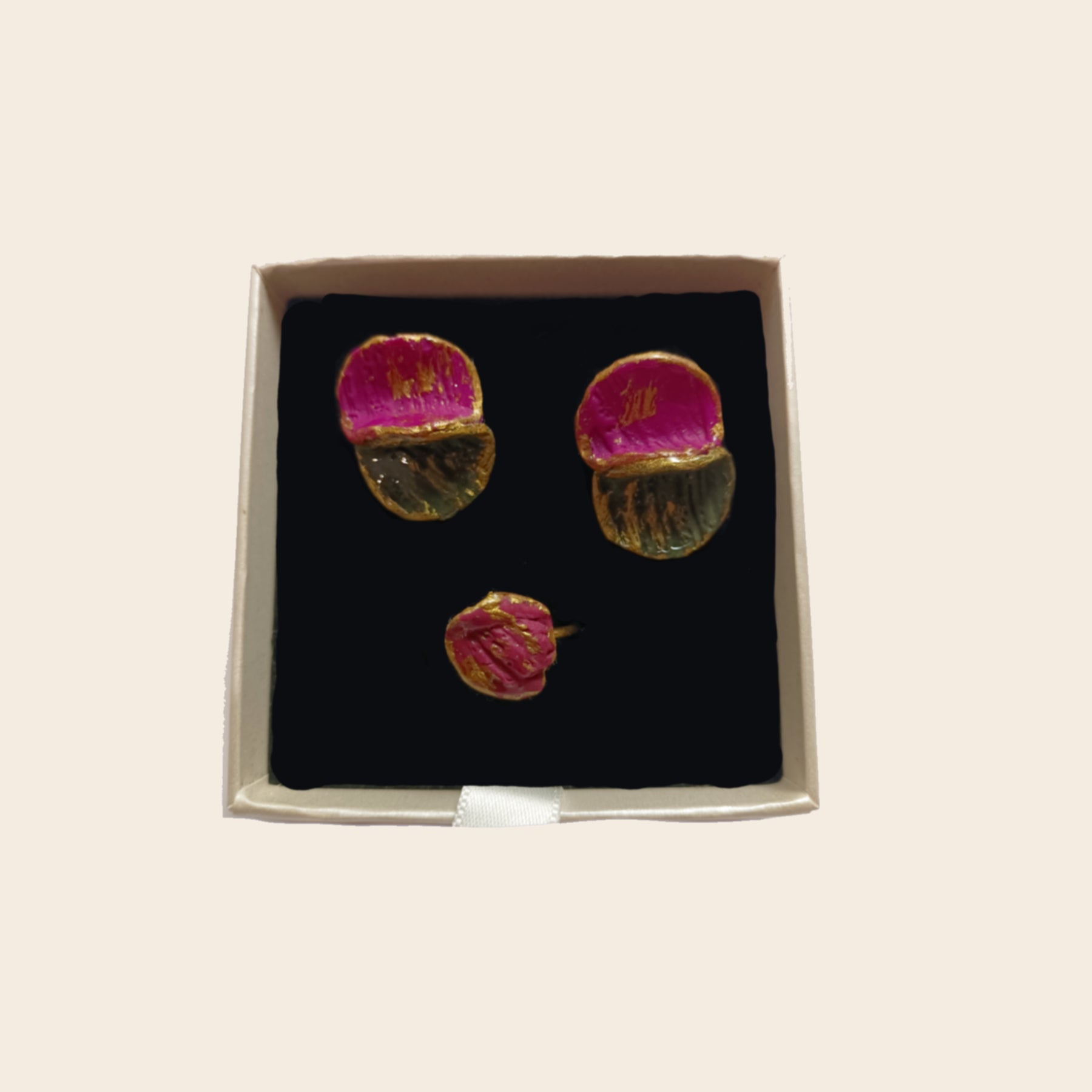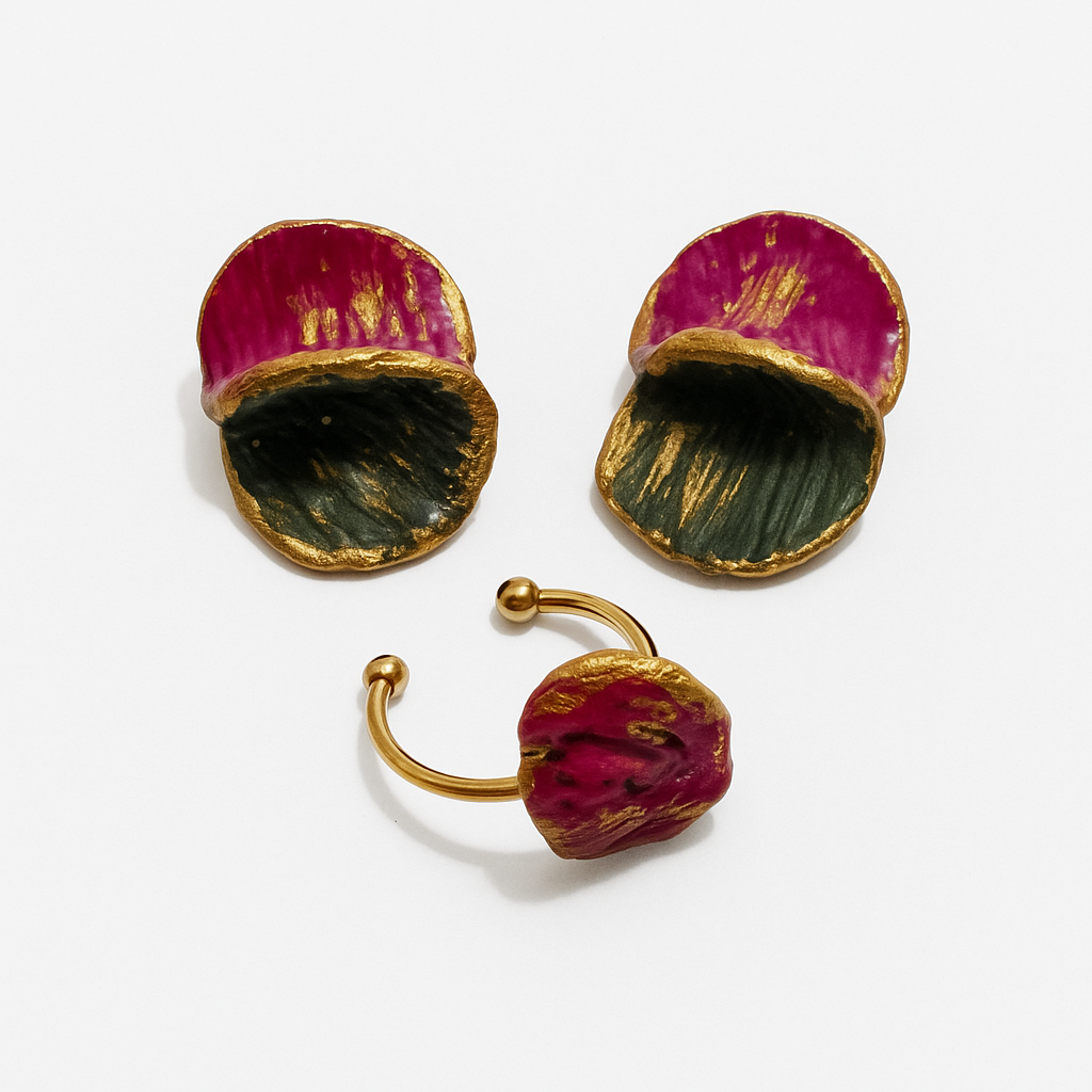 Los pétalos combinan la intensidad del fucsia con la serenidad del verde, iluminados con destellos dorados en resina, reflejando tu magnetismo y tu armonía interior. El anillo, con su pétalo en fucsia, completa este conjunto, convirtiéndolo en un talismán que acompaña tu día a día y brilla en cada momento especial.