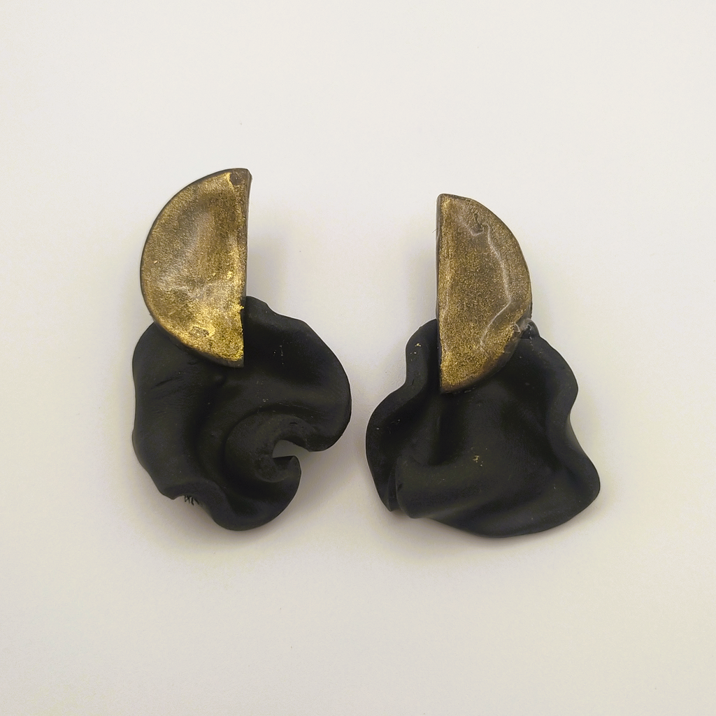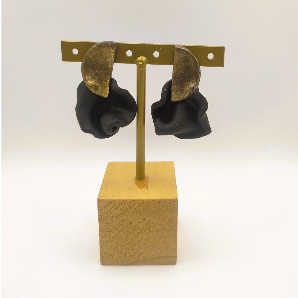 Una medialuna en dorado envejecido sostiene una pieza negra mate, cada curva modelada a mano y única en su carácter.