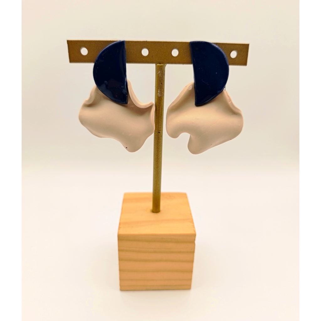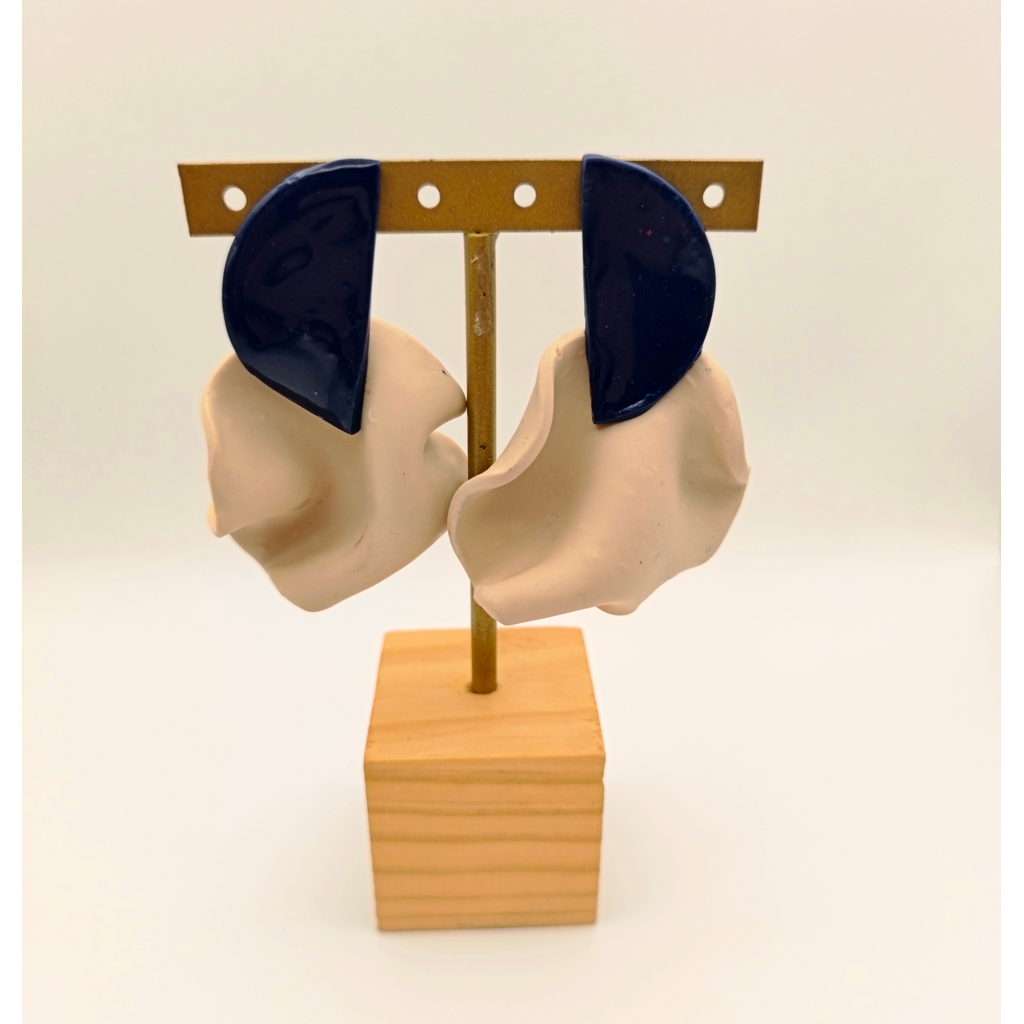 Una medialuna azul marino abraza una pieza crema mate, cada curva moldeada a mano y única.