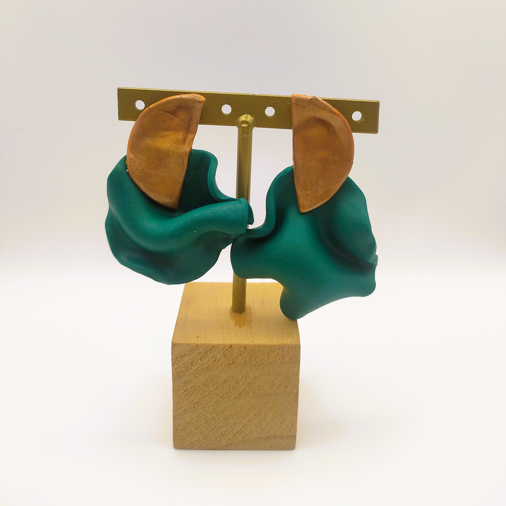 Pendiente inspirado en la diosa Isis: una medialuna naranja metalizada sostiene con delicadeza una pieza verde mate.