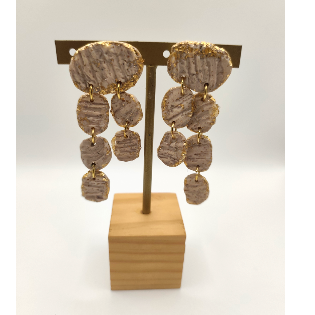 Estos pendientes largos de seis piezas combinan el tono crema con delicados destellos de pan de oro, creando un juego de luz que irradia elegancia y simbolismo.