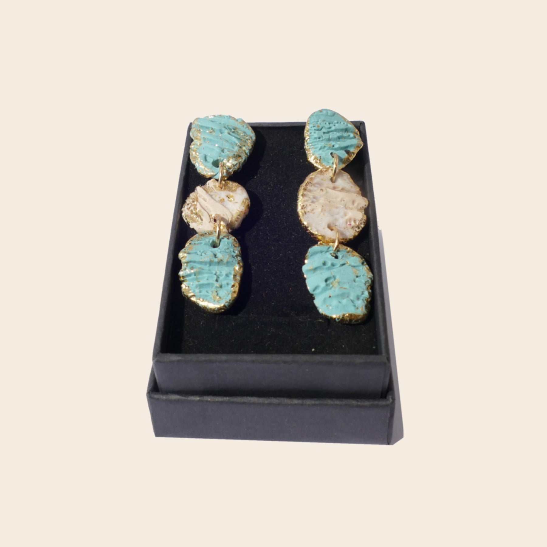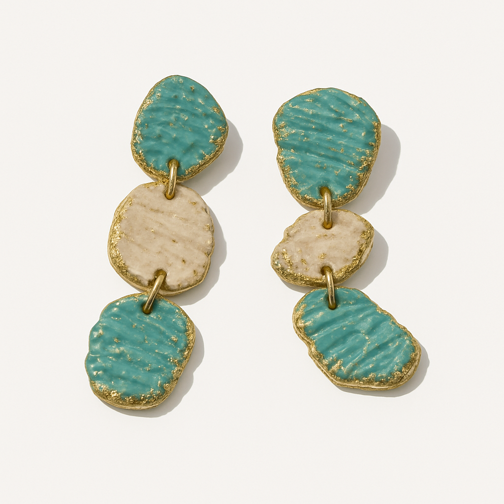 Tres piezas que flotan entre turquesa y crema, salpicadas de pan de oro, como un pequeño universo que recuerda que la abundancia y la belleza siempre te rodean.