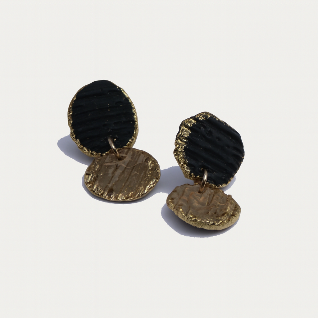 Estos pendientes largos de dos piezas juegan con negro profundo y moka, acentuados por finos toques de pan de oro que reflejan luz en cada movimiento.