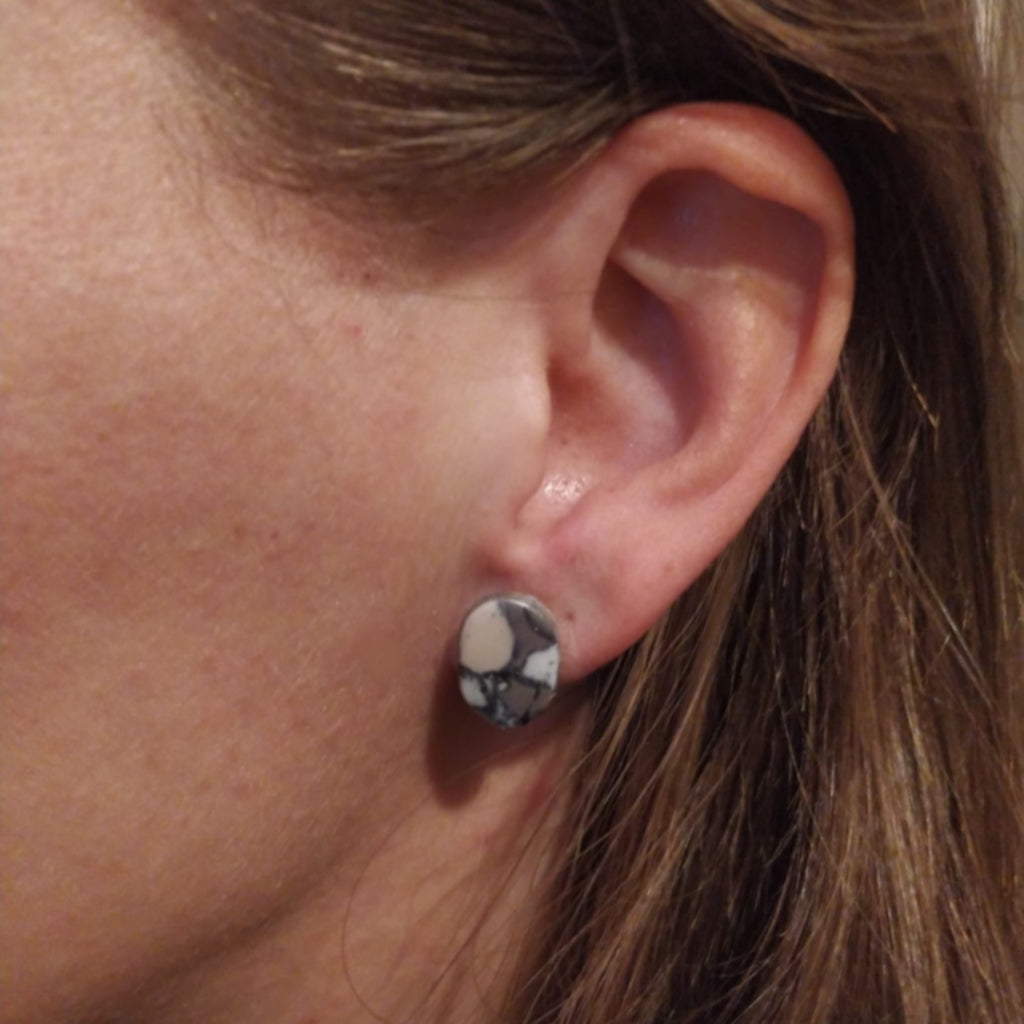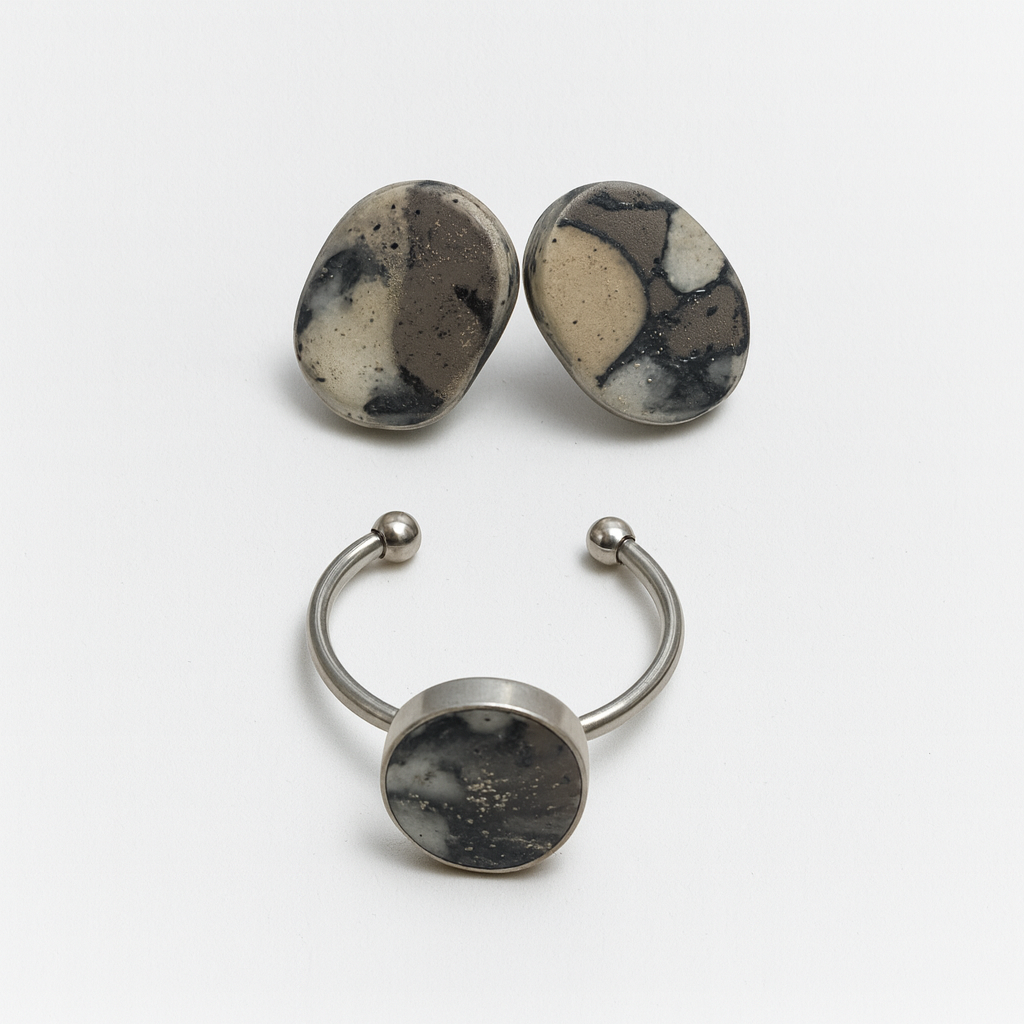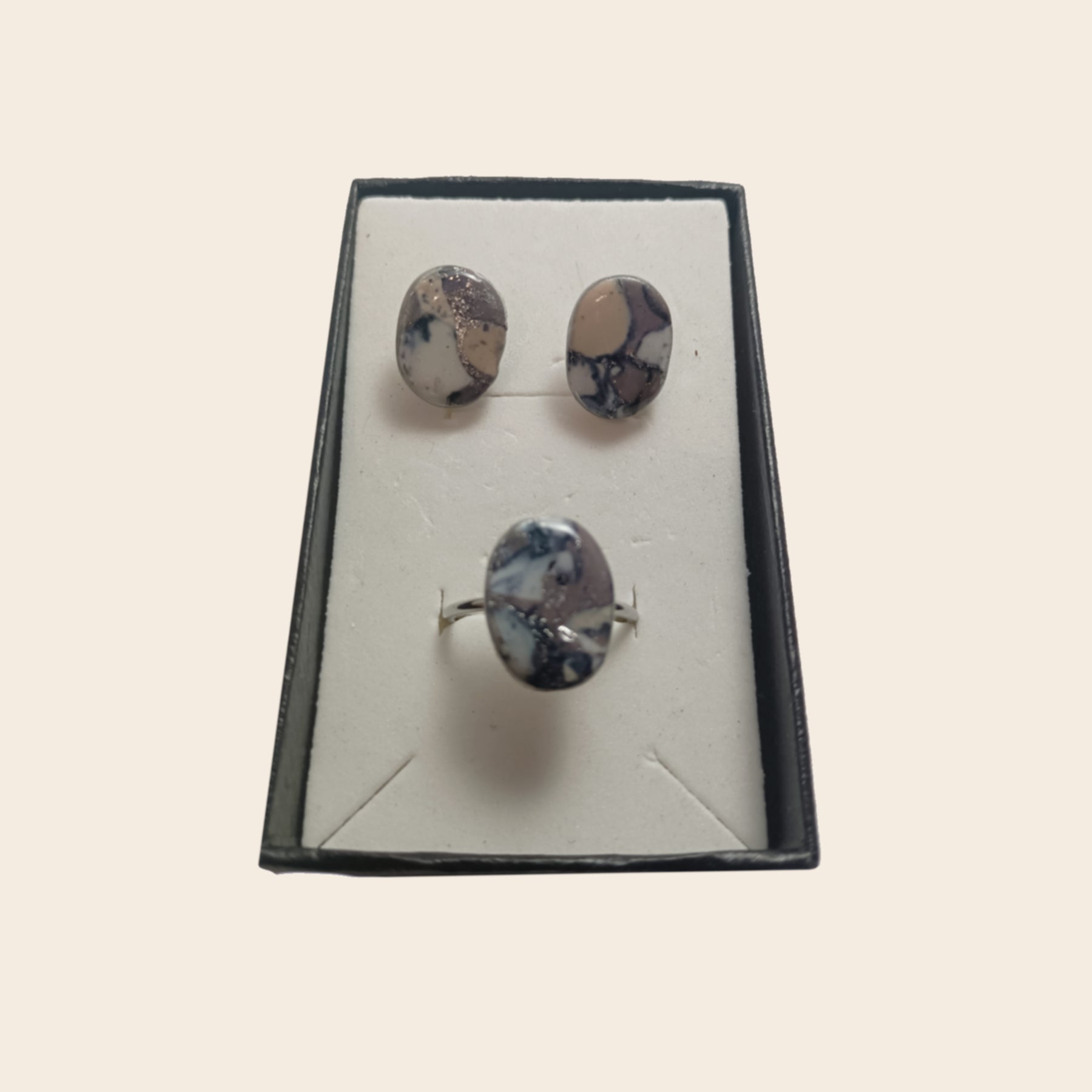 Su efecto marmolado en tonos café, acompañado de destellos plateados, aporta elegancia cálida y carácter propio. El anillo ajustable y los cierres de acero inoxidable aseguran comodidad y durabilidad en el uso cotidiano.