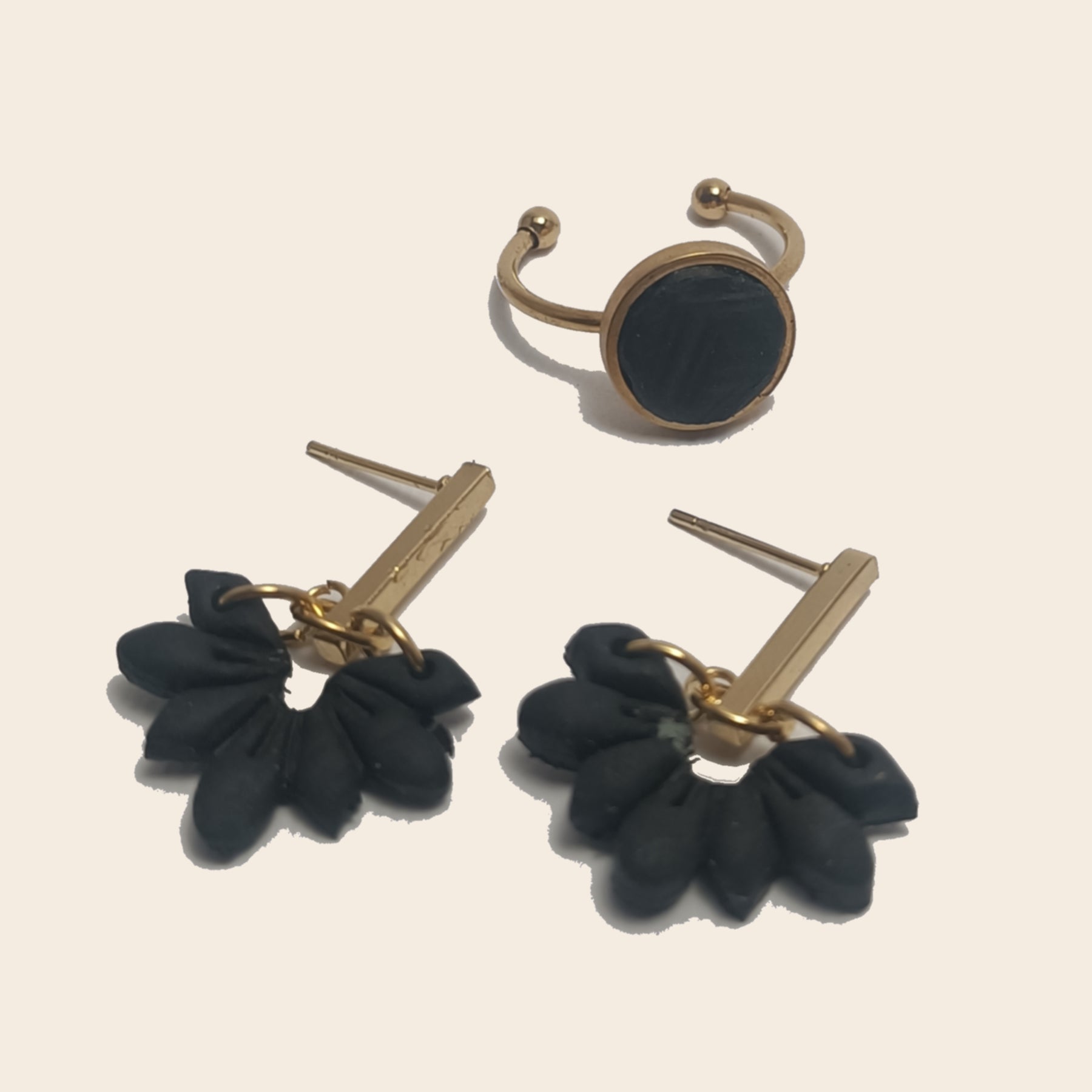 El negro profundo de la arcilla aporta elegancia y fuerza, mientras que el anillo ajustable, con su textura rugosa, completa el conjunto con carácter, versatilidad y un toque de misterio.