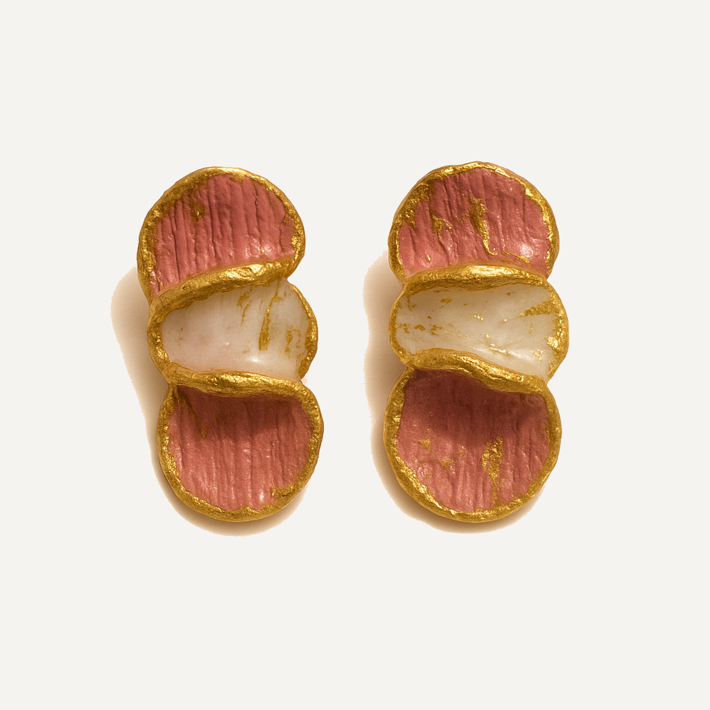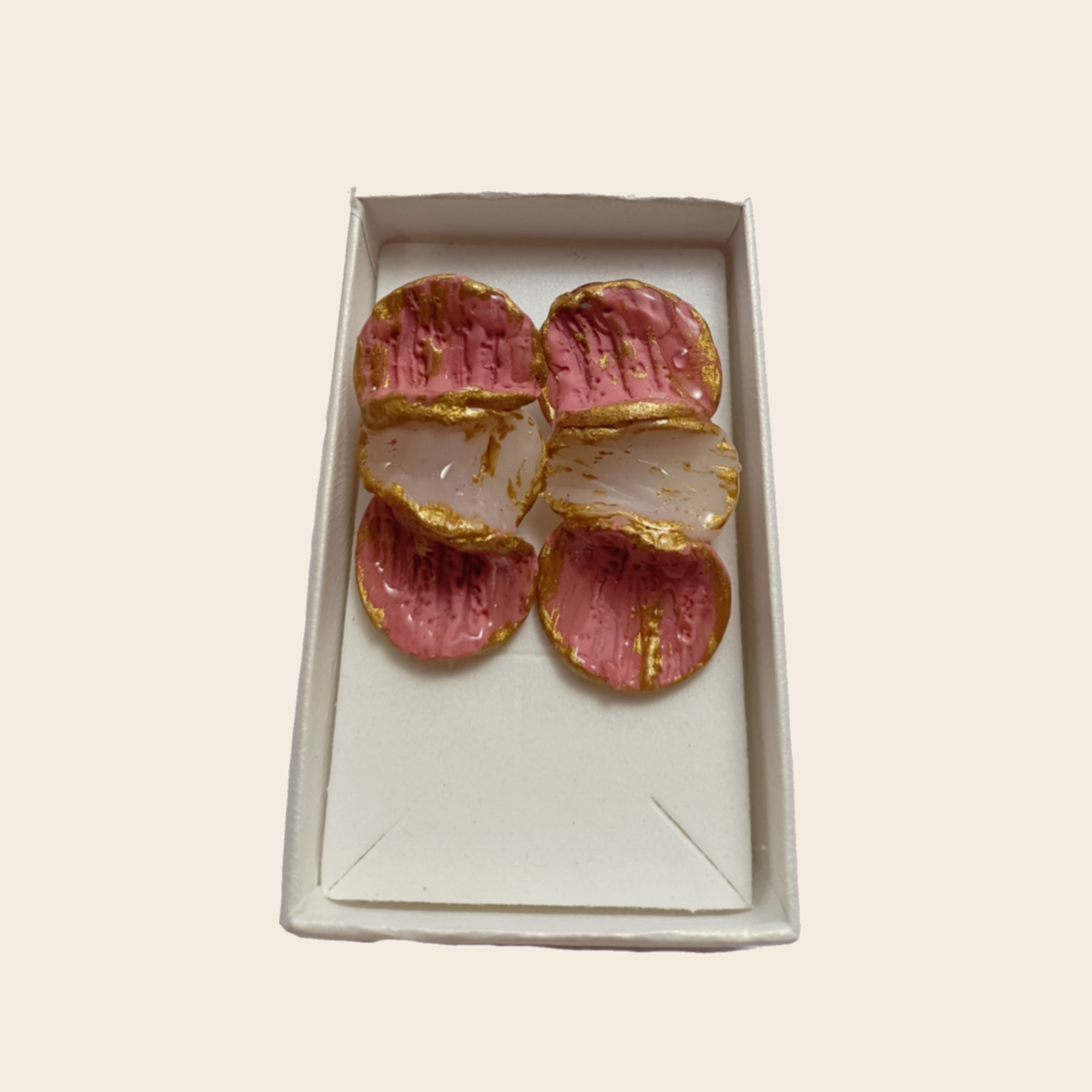 Los pétalos en rosa pastel y translúcido, salpicados de destellos dorados y brillantes en resina, parecen capturar la luz con cada movimiento, recordándote tu magnetismo y tu energía única.