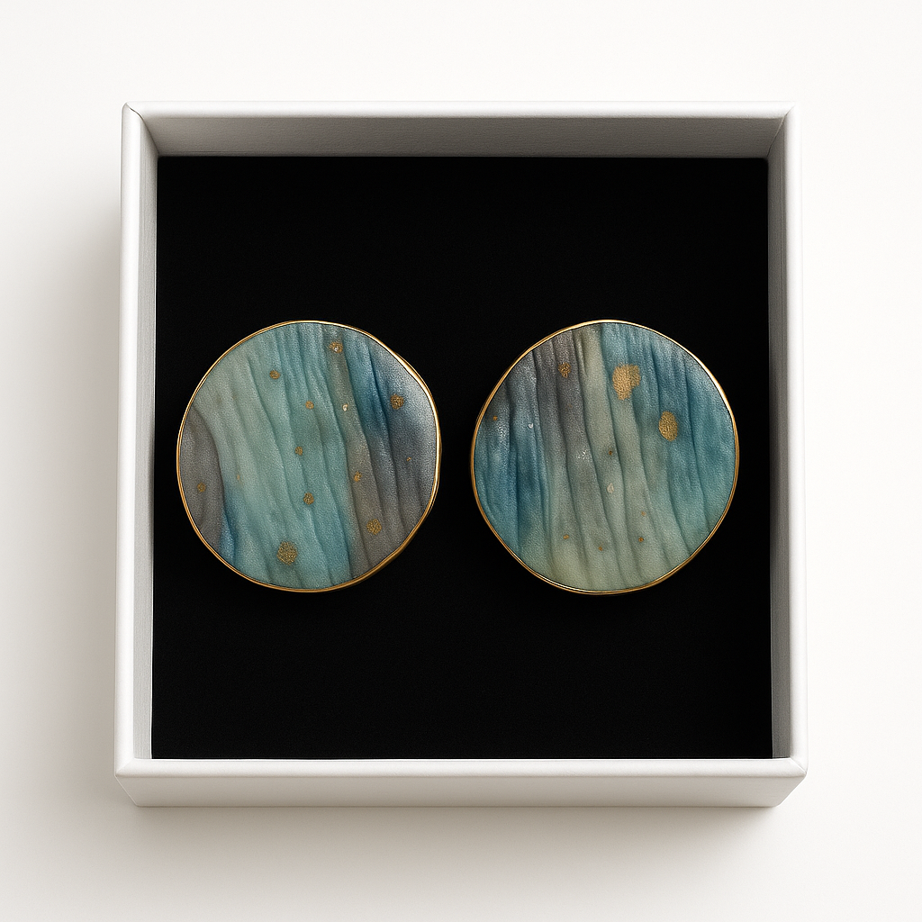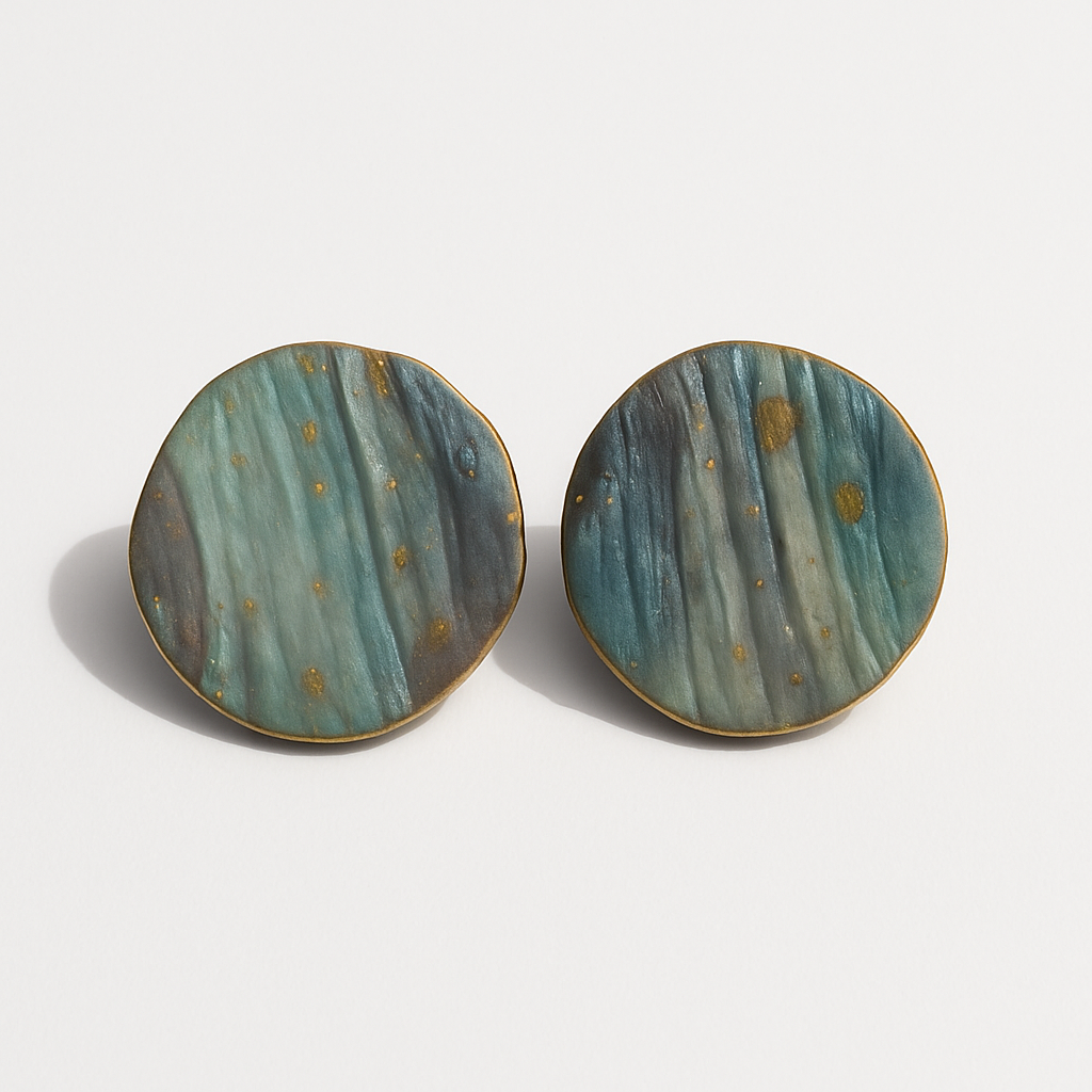 Descubre Sarasvati, pendientes hechos a mano en un juego de turquesa profundo, dorado cálido y gris elegante, donde cada matiz parece capturar la luz y la imaginación. Su textura rugosa y orgánica evoca la materia viva de la naturaleza.