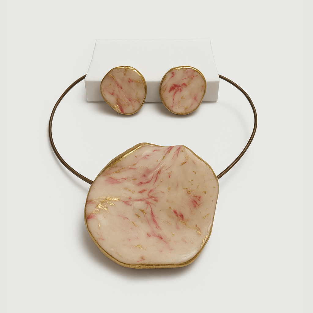 Descubre Sarasvati, un conjunto de pendientes y colgante donde crema, fucsia y dorado se entrelazan como un lienzo de inspiración.