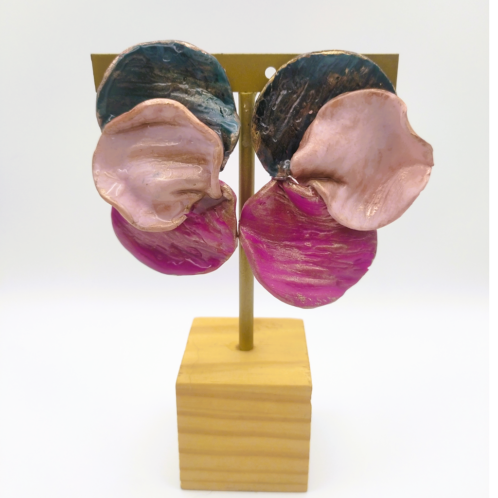Hechos a mano en arcilla polimérica, combinan verde esmeralda, fucsia y rosa palo, y se iluminan con destellos de bronce y el suave brillo de la resina, como la luz del sol filtrándose entre hojas y flores.