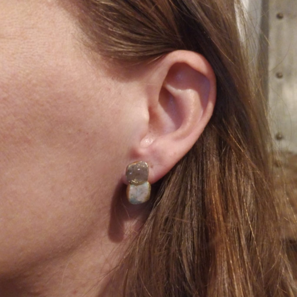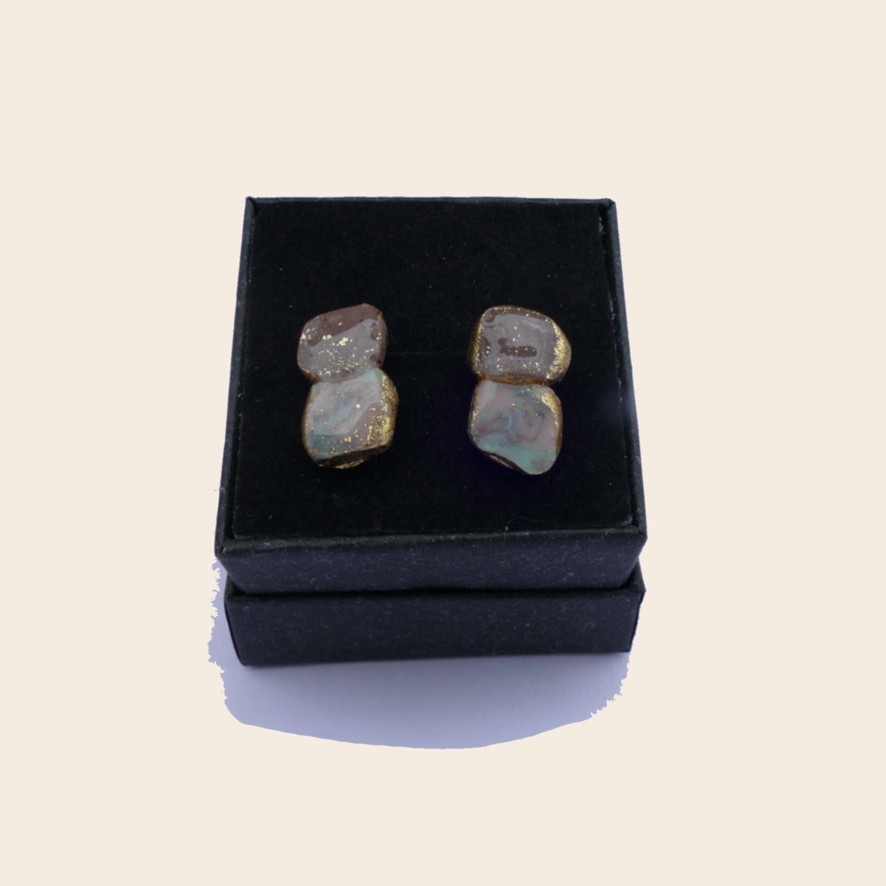 Este modelo combina tonos moka y pasteles, evocando el delicado equilibrio entre lo terrenal y lo divino. Decorado con pan de oro y resina que captura la luz en cada movimiento.