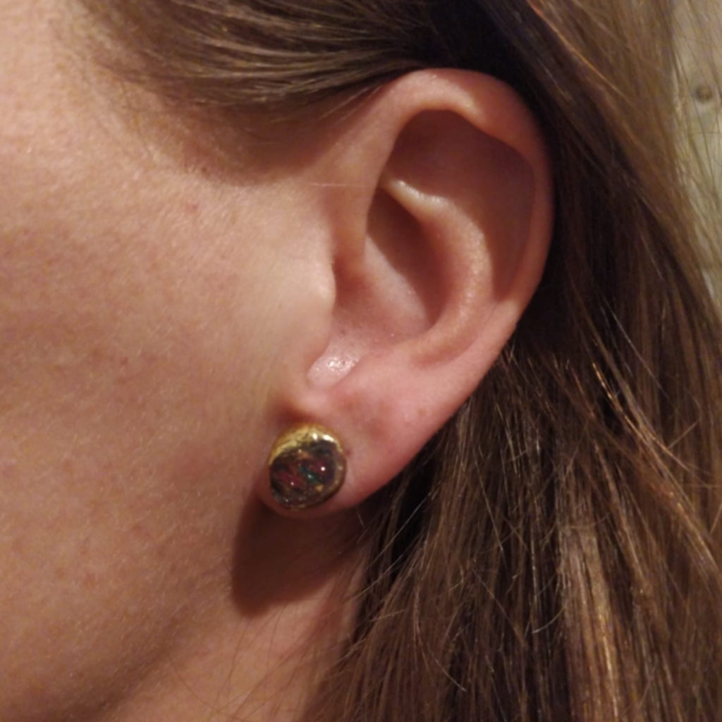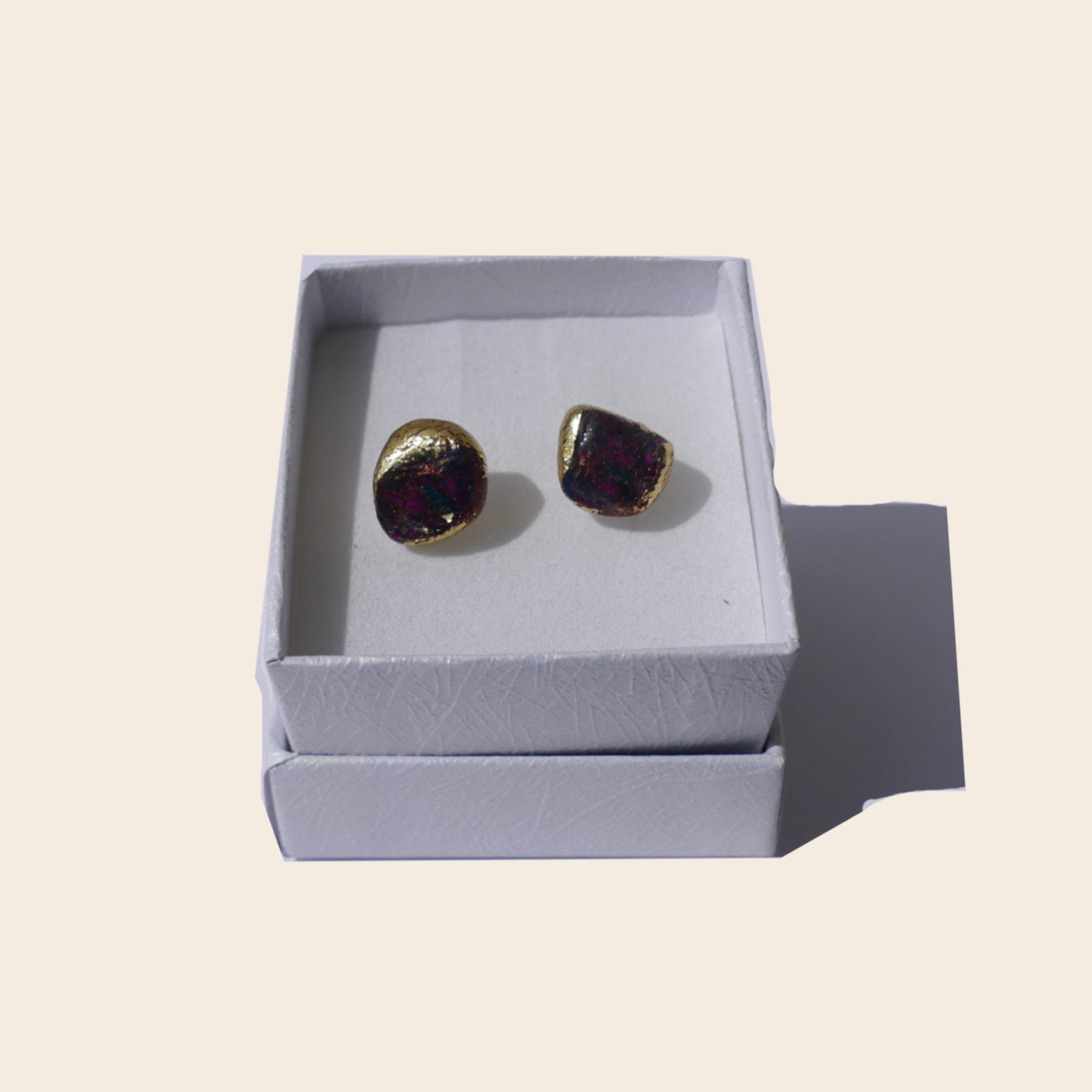 Hechos a mano en tonos fucsia y azul, salpicados de destellos dorados y decorados con pan de oro y resina que captura la luz, estos pendientes son joyas únicas, ligeras y llenas de personalidad.